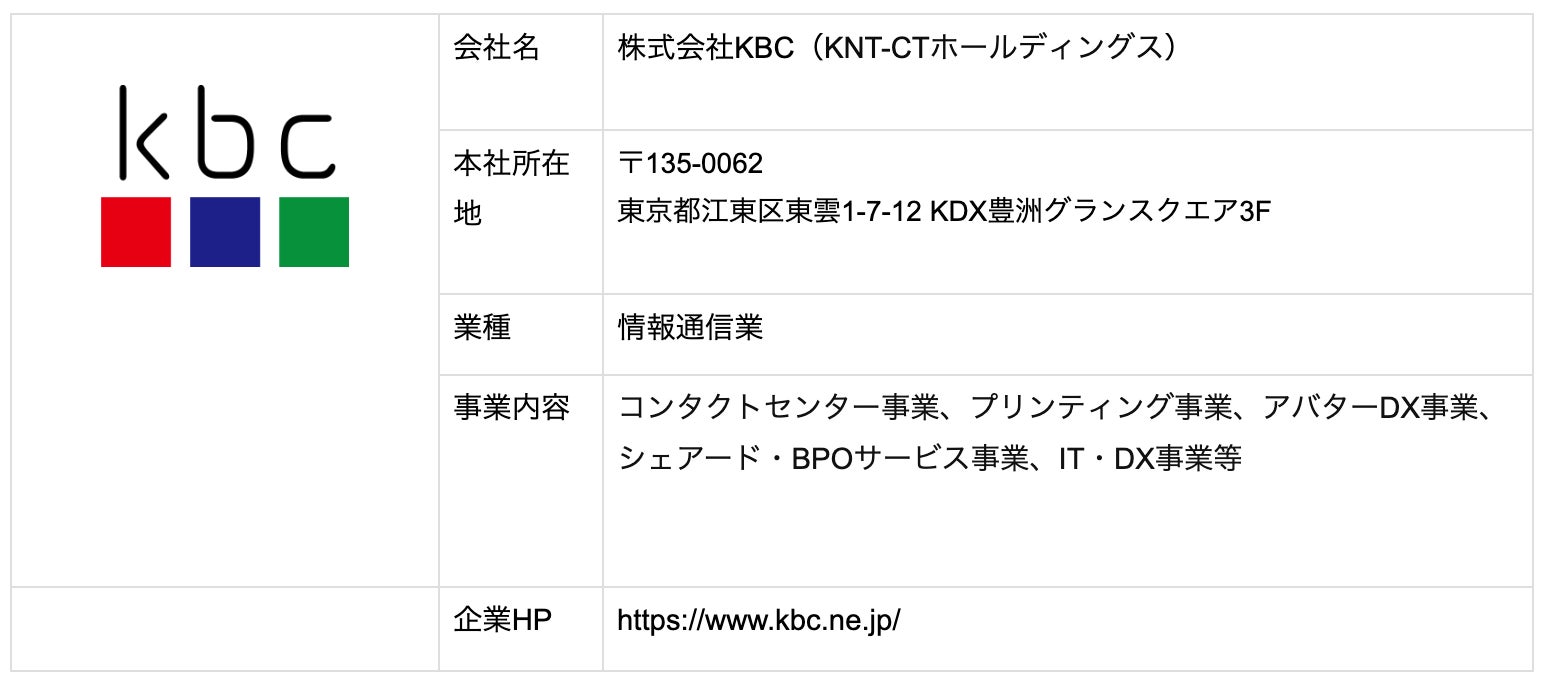 株会社KBCは、KNT-CTホールディングスグループ内外のコーポレート業務を集約し、生産性や効率性の向上を追求するシェアード・BPOサービス事業や、システム開発や運用、管理など、IT関連業務全般を請け負うIT・DX事業をメインとし、アバター制作やアバター関連のコンテンツてい用、オンデマンド印刷などのプリンティング事業を主軸とした会社です。