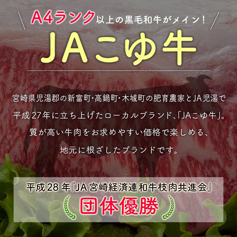 ≪JAこゆ牛とは?≫ 宮崎県児湯(こゆ)郡 の新富町・高鍋町・木城町の肥育農家とJA児湯が平成27年に立ち上げた宮崎黒毛和牛のローカルブランドです。肉質はA4ランク以上が大半を占め、認知度の高い宮崎牛と同等の高品質。平成28年に開催された 『JA宮崎経済連和牛枝肉共進会』では団体優勝しました。