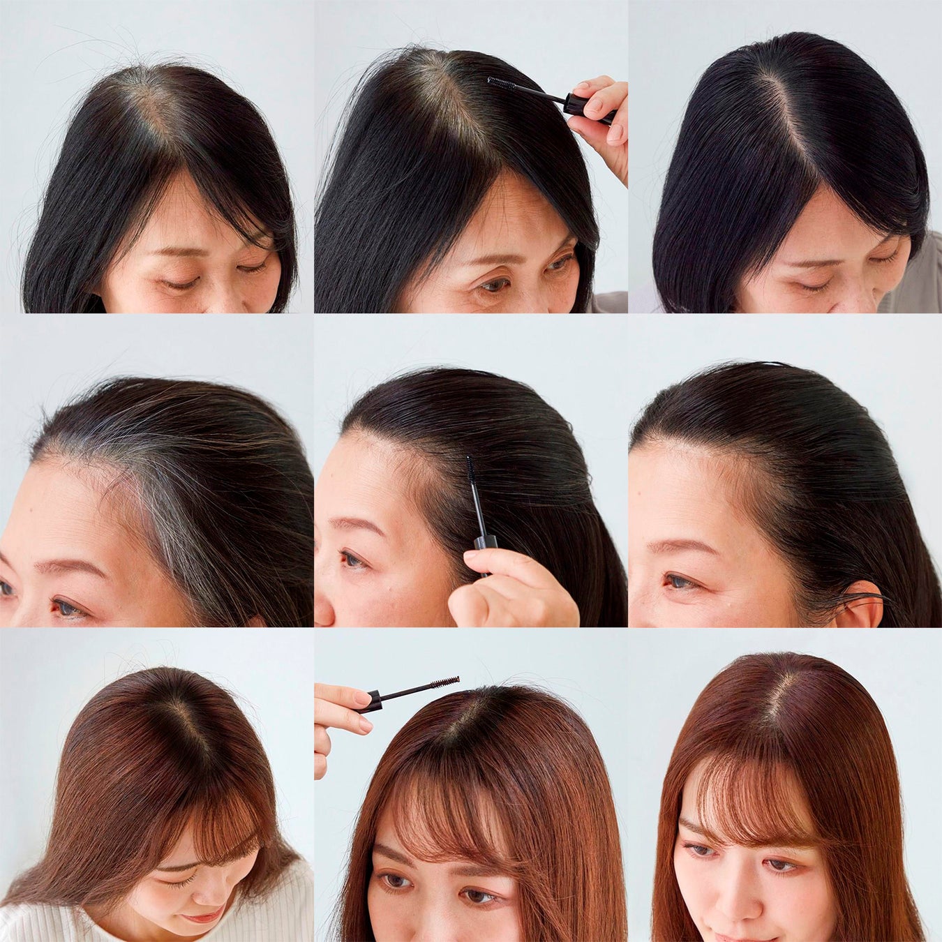 2容器を立てた状態でゆっくりブラシを引き抜き、あほ毛や白髪の生え際から毛先に向かって、飛び出た髪を寝かせるように塗布します。塗布後は乾くまで触らないでください。