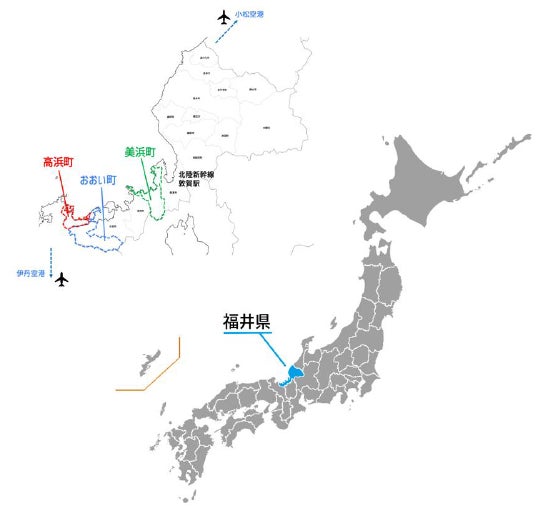 福井県高浜町、おおい町、美浜町は日本海沿岸に位置し、美味しい海の幸や地酒などの名産があります。また、多数の魅力的な観光地を有しています。今回の「ANA LIVE SHOPPING」の配信拠点でもある高浜町の「UMIKARA」は、漁港と隣接し毎朝水揚げされた新鮮な魚介が購入できるマーケットです。また、おおい町の道の駅「うみんぴあ大飯」、美浜町の道の駅「はまびより」などは各町ならではの”いいもの”を購入できるスポット。アジアで初の国際環境認証「BLUE FLAG」を取得した抜群の透明度と遠浅の海白く広い砂浜が特徴の「若狭和田ビーチ」。5つの湖「三方五湖」を眺めることのできる絶景の「レインボーライン山頂公園」など、写真映えも抜群の美しいスポットなどが近接しています。