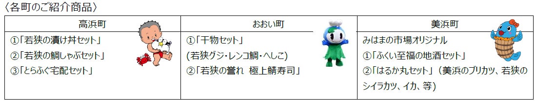 商品のラインナップは、高浜町からはUMIKARAの「漬け丼」や「鯛しゃぶセット」、昭和55年創業の料理民宿ふぐ料理五作荘の「とらふぐセット」。おおい町から「干物セット」、「若狭の誉れ 極上鯖寿司」。美浜町からは、道の駅はまびより内農林水産物直売所「みはまの市場」のオリジナル「ふくい至福の地酒セット」、海鮮がセットになった、「はるか丸セット」など各エリアの名産をご紹介します。