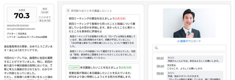 これらの課題を解決するため「exaBase ロープレ」を導入。AIアバターを活用することで、リアルな対話体験を提供し、社員が自然な形でロールプレイングを行える環境を実現しました。AIによる客観的な評価とフィードバックを通じた、個々のスキル向上を効率的にサポートすることで、社員の対応力を高め、より質の高いサービスをお客さまに提供できる体制を構築しました。