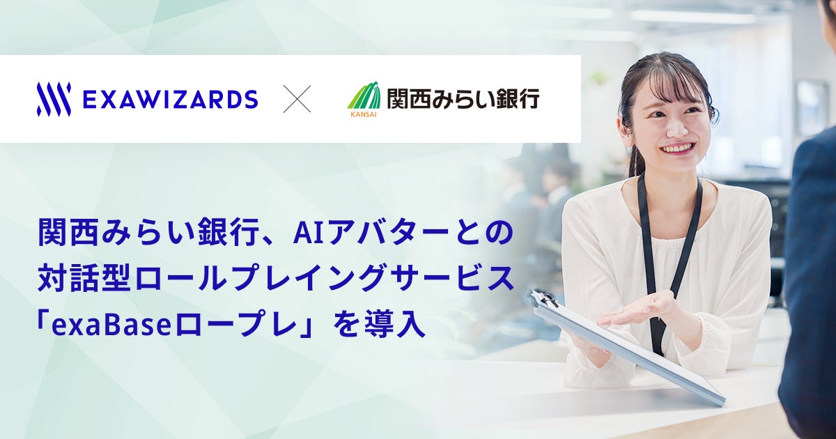 株式会社エクサウィザーズ(東京都港区、代表取締役社長CEO:春田真、以下エクサウィザーズ)は、株式会社りそなホールディングス(東証プライム:8308)傘下の株式会社関西みらい銀行(大阪府大阪市中央区、代表取締役社長 西山 和宏、以下関西みらい銀行)が、AI対話型のロールプレイングサービス「exaBase ロープレ」を導入したことをお知らせいたします。