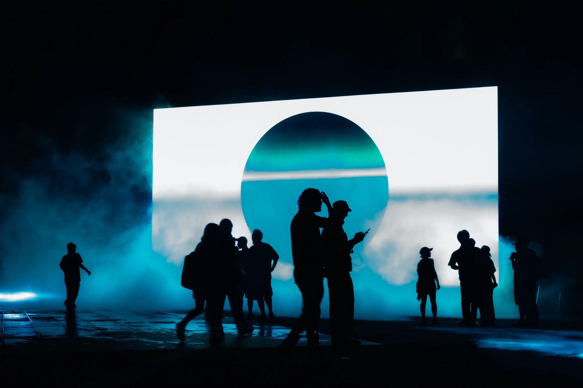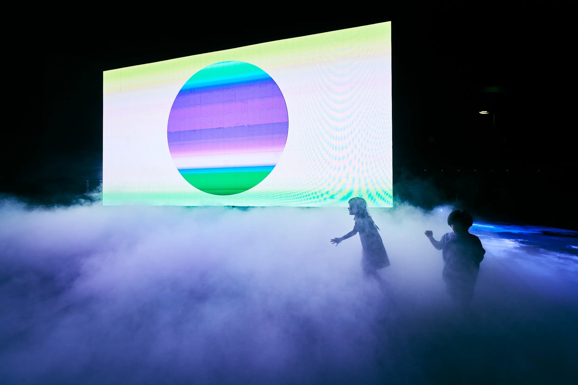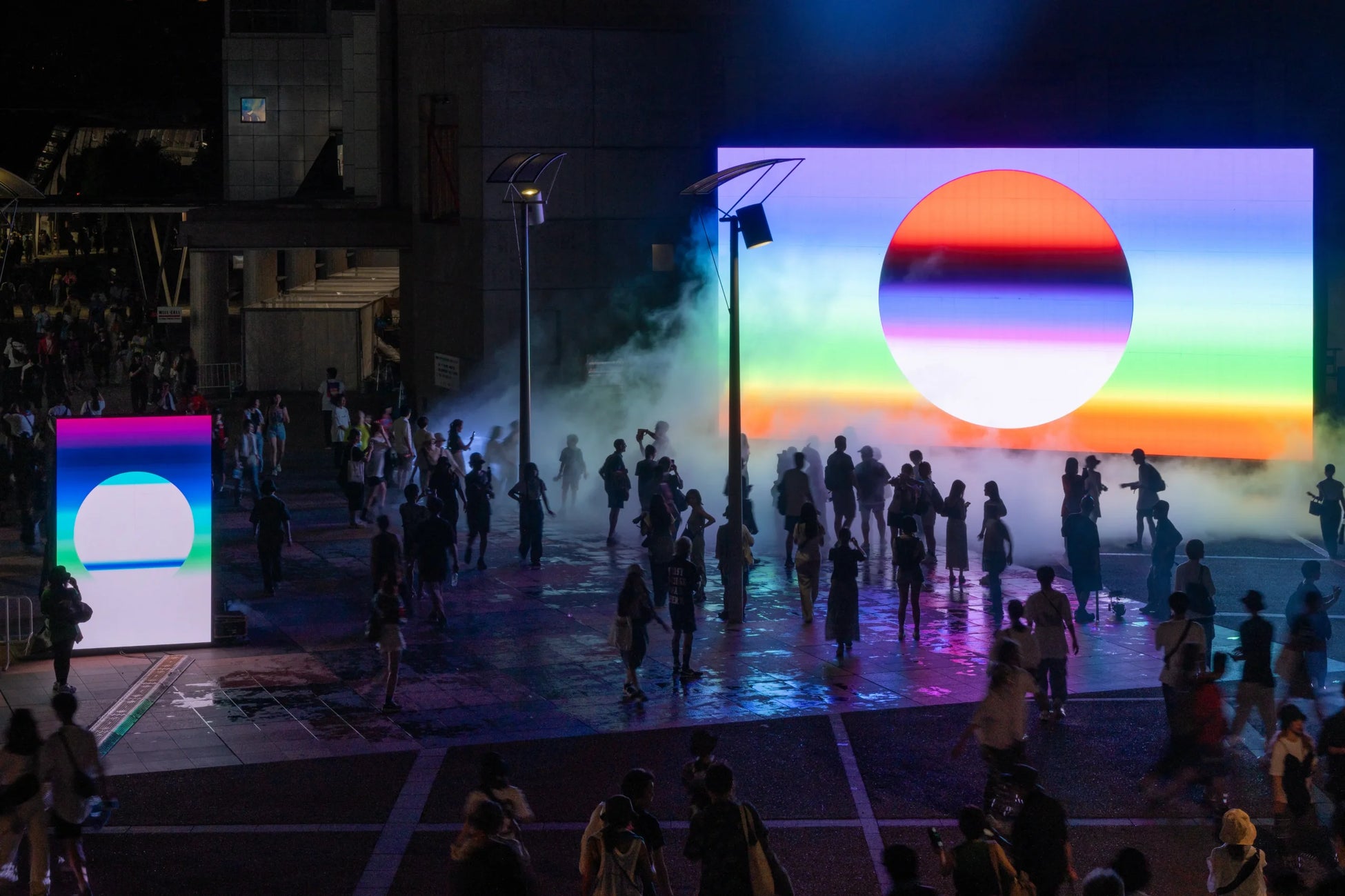 夜間の幕張メッセ前広場に現れる「SUN」インスタレーションは、国内最大級サイズのLEDディスプレイとサウンド、ミストによって可視化されるファイバービームによって幻想的に鑑賞する作品。ミニ・バーで喉を潤し、語らいながら、作品の世界に浸り、ゆっくりとアートと音楽を楽しむ神秘的なアンビエントを体感。19日の夜には、電子音楽家のKuniyukiやTakakahnによるオーディオライブが特別に披露されました。