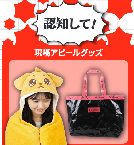 ライブグッズの定番であるジャガードタオルをはじめ、大容量のレジャーシートバッグや指にはめると光るリングライトなど、手に持つだけで映えるオリジナルグッズを展示。「人の多い現場でも、埋もれずに目立つグッズで推しに気づいてもらいたい!」というファンの需要に刺さるグッズが見つかります。