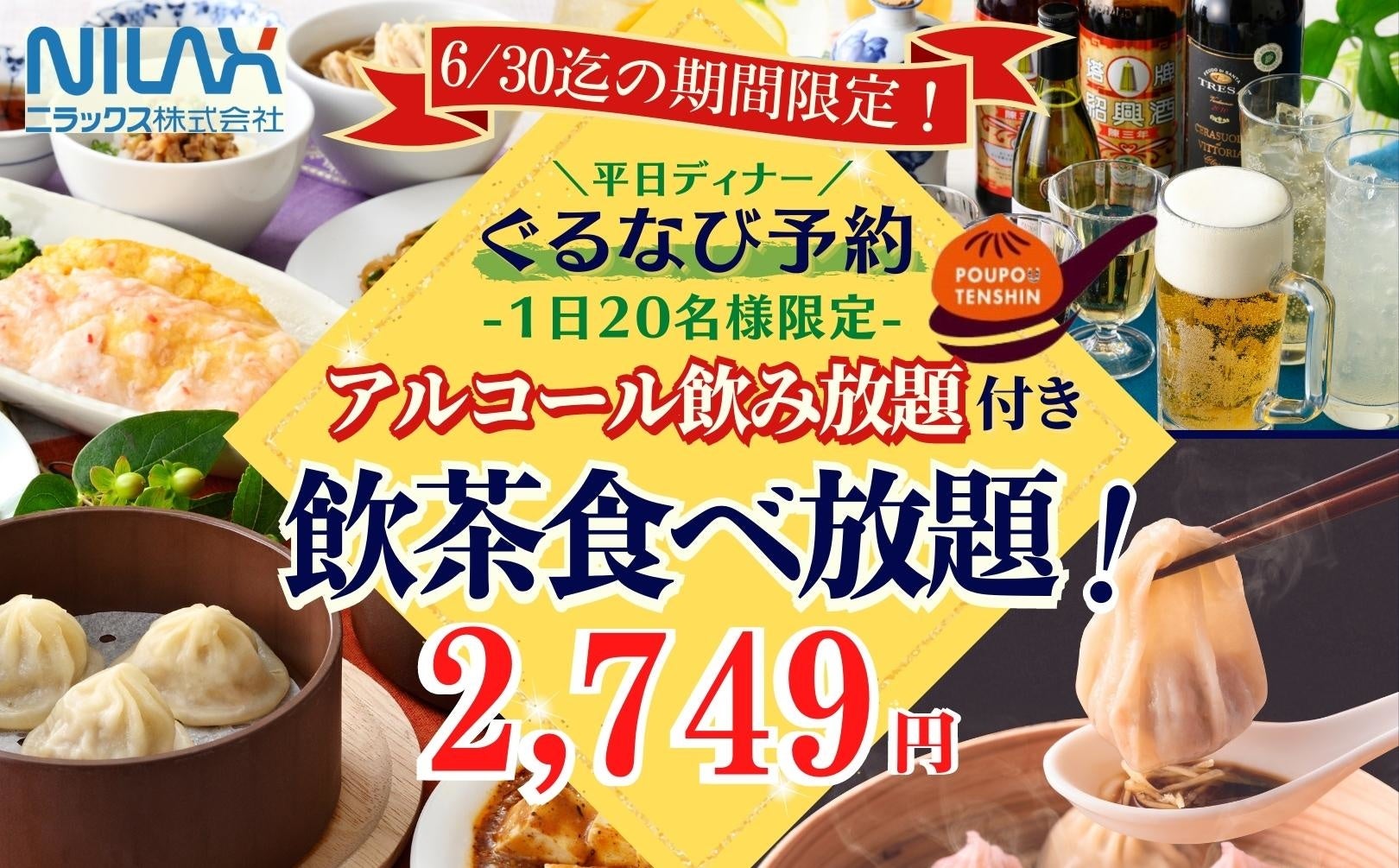 食べ放題のテーマパーク、ニラックス株式会社(本社:東京都武蔵野市、代表取締役:崎田 晴義)が運営する『ザ ブッフェ 包包點心 (ポウポウテンシン) 市川ニッケコルトンプラザ 店』では、2022年6月30日(木)迄の期間、平日ディナー1日20名様限定、ぐるなび予約でプレミアムコースに60分間のアルコール飲み放題が付いたお得なコースが登場いたしました。