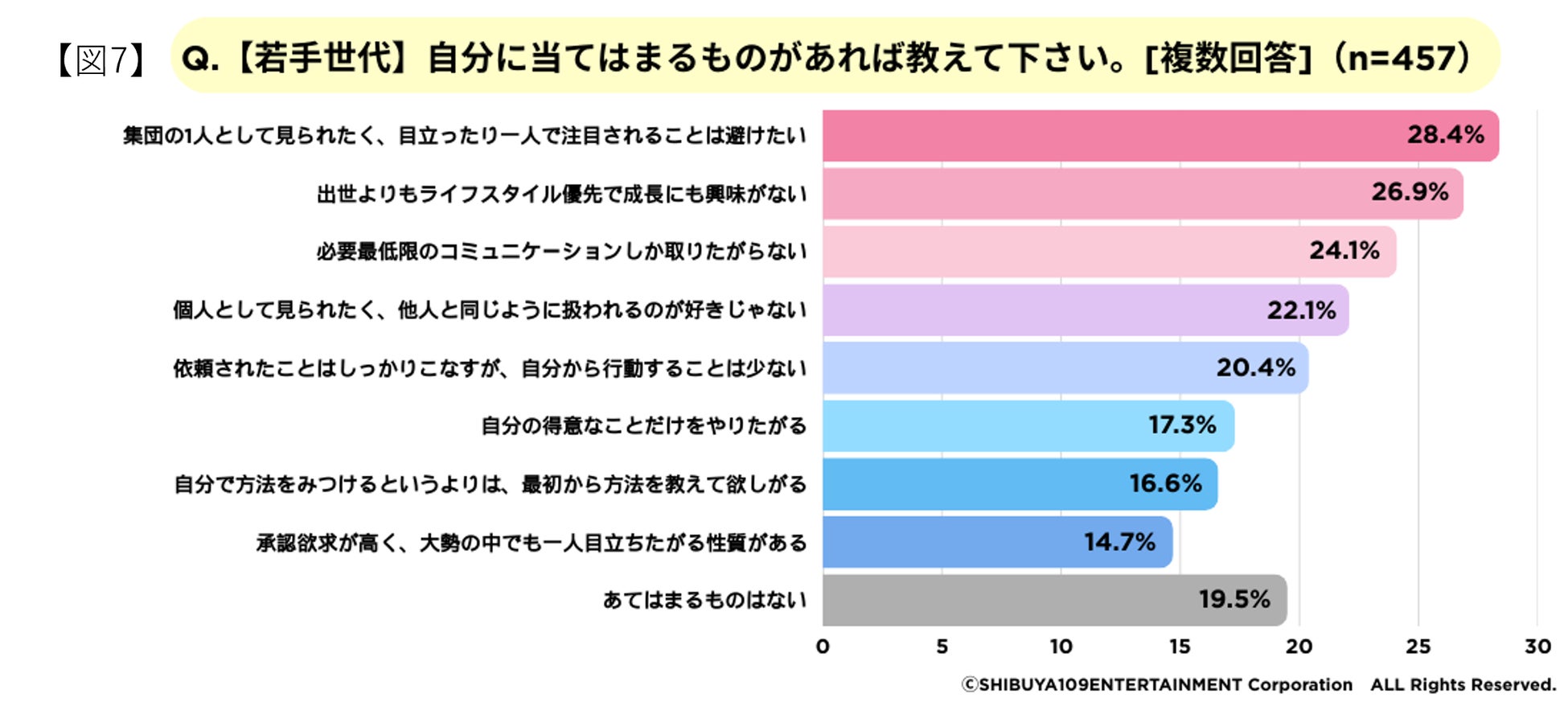 働く価値観について聴取した設問の上位項目では、「集団の一人として見られたく、目立ったり一人で注目されることは避けたい(28.4%)」「出世よりもライフスタイル優先で成長にも興味がない(26.9%)」、「必要最低限のコミュニケーションしか取りたくない(24.1%)」となりました。