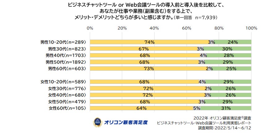性年代別では、「メリットが多い」の割合が最も高いのは「男性10・20代」(74%)、次いで「男性60代」(73%)、「女性30代」「女性40代」(72%)が続きました。一方、「メリットとデメリットは同じくらい」の割合が最も高いのは「女性60代」(31%)となっています。