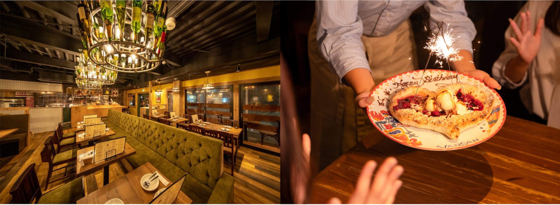 昼はご家族に最適なアットホームなイタリアンレストラン、夜はあたたかい雰囲気の中にも色気を感じるイタリアンバールに変化を遂げます。キッズスペースやキッズメニューもご用意しておりますので、幅広いニーズにお応えします。お誕生日や記念日にぴったりの、プレートにメッセージを書いたハートのピッツァで大切な方へのサプライズ演出もございます。店内は広々64席。ワインボトルで作られた大きなシャンデリアが目を引き、ウッドをメインにした落ち着いた空間となっております。