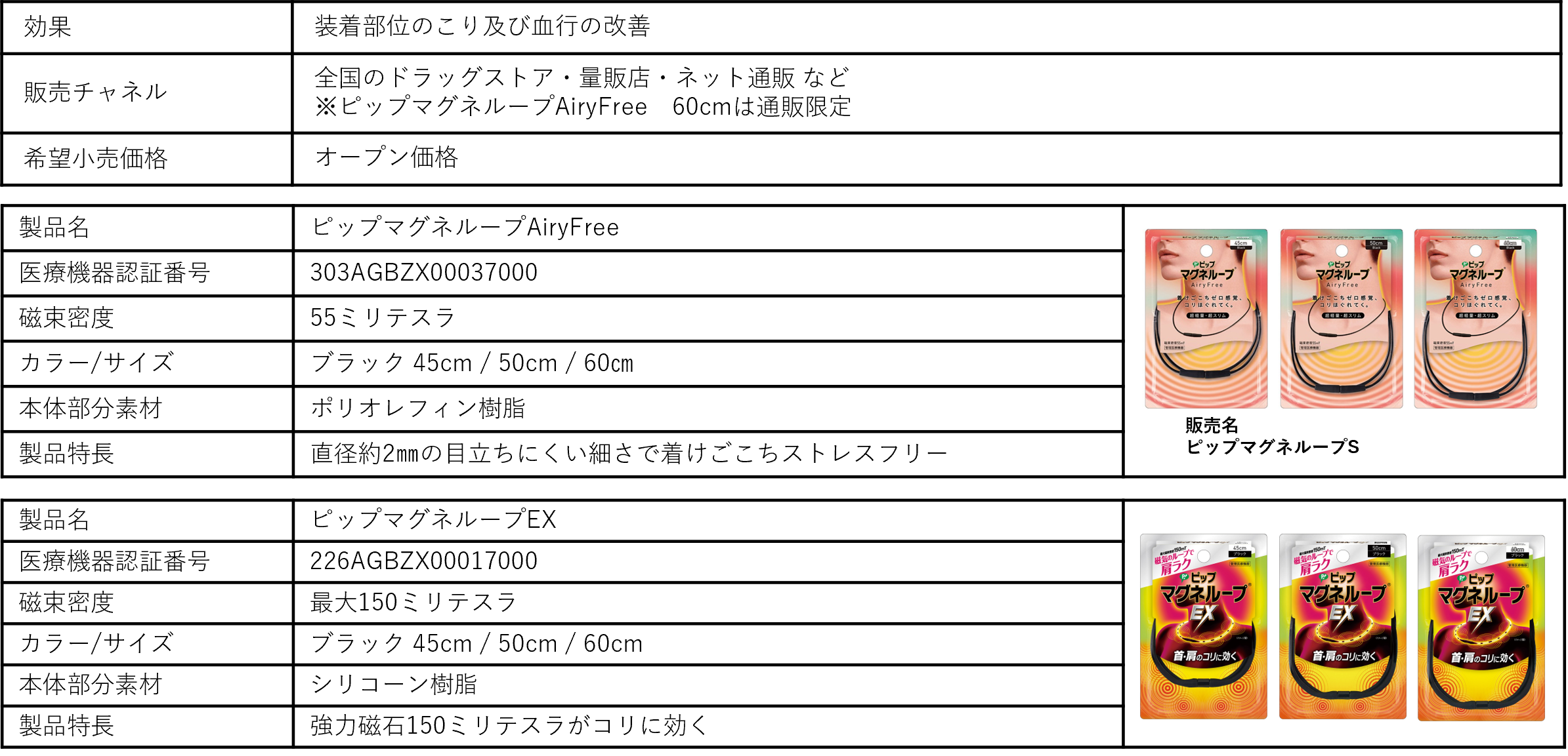 「ピップマグネループ」シリーズの中の定番品である「ピップマグネループEX」をはじめ、ループの細さと軽いつけ心地が特長の「ピップマグネループAiryFree(エアリーフリー)」や、シリーズ最強の200ミリテスラの強力磁力がガンコなコリにしっかり効く「ピップマグネループMAX」をご用意しています。