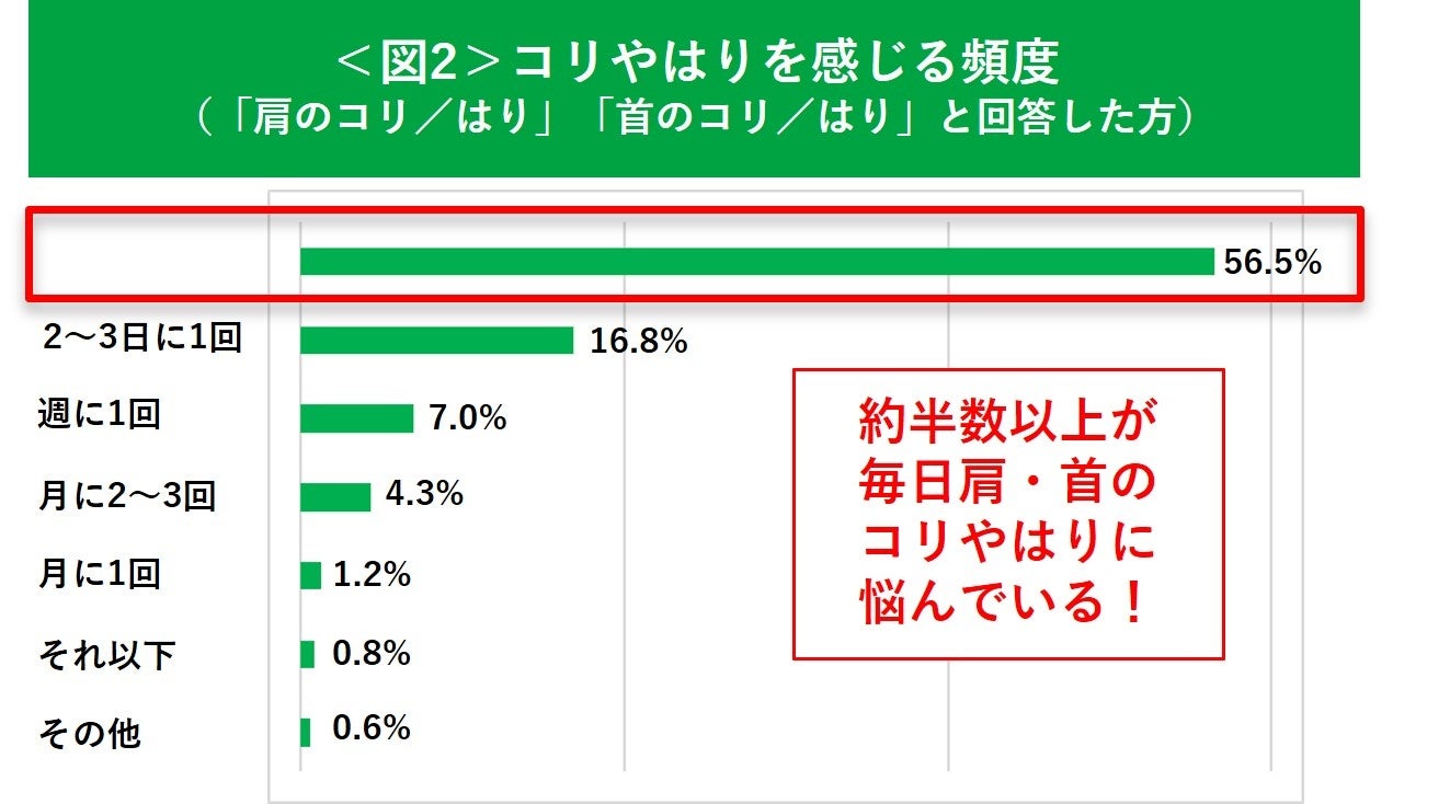 今回実施した調査によると、最近1年以内に気になったことがある症状として、「肩のコリ/はり(81.1%)」と回答した方が最も多く、次いで「首のコリ/はり(68.6% )」と回答した方が多いという結果になりました<図1>。「肩のコリ/はり」「首のコリ/はり」と回答した方に、コリやはりを感じる頻度について聞いてみると、「毎日」と回答した方が56.5%に上っています<図2>。