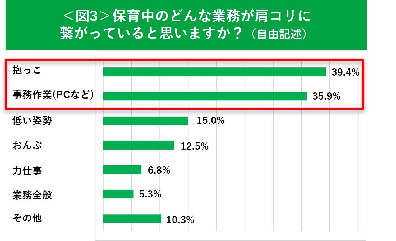 ✓ 保育中の「抱っこ」や「事務作業(PCなど)」が肩のコリに繋がっていると回答した方が多い。