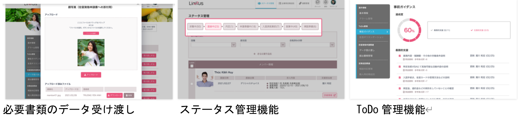 Linkusは「技能実習」「特定技能」の雇用・管理に必要な機能が「全て」揃うので、登録機関、送り出し機関だけではなく、受け入れ企業単独での活用も有効です。