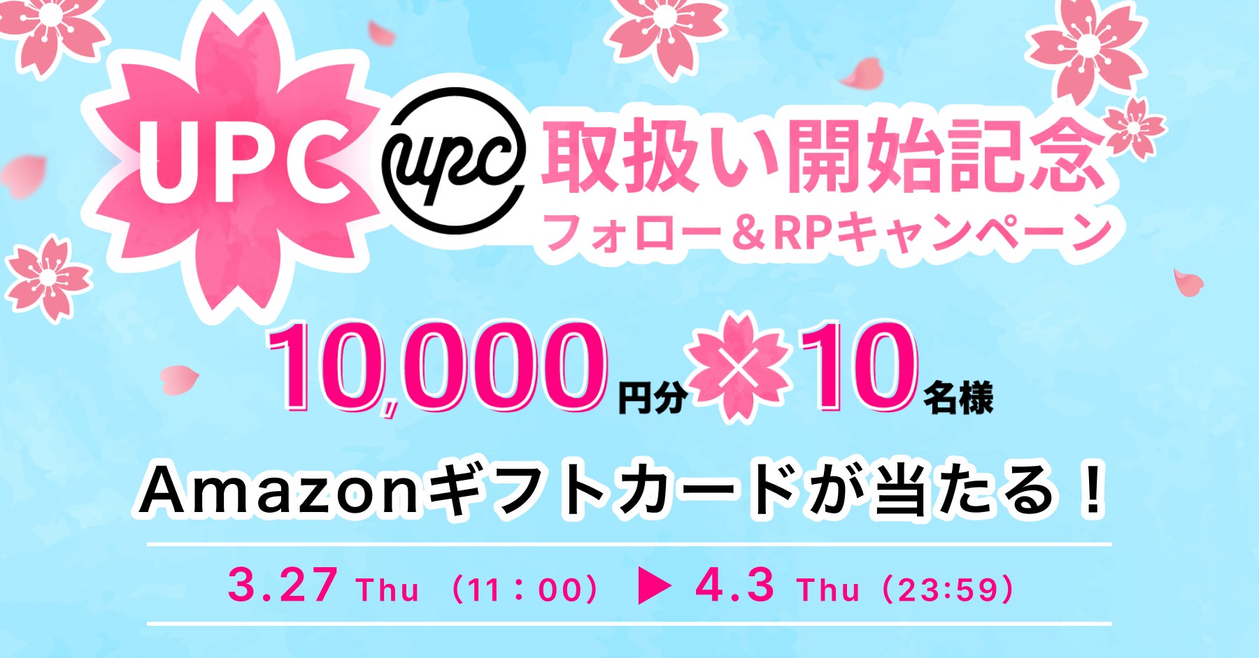 ビットトレード株式会社(所在地:東京都港区、代表取締役社長:関 磊、以下「ビットトレード」)は、3月27日(木)11:00より、1万円分のAmazonギフトカードが10名様に当たる!UPC取扱い開始記念フォロー&RPキャンペーンを実施いたします。