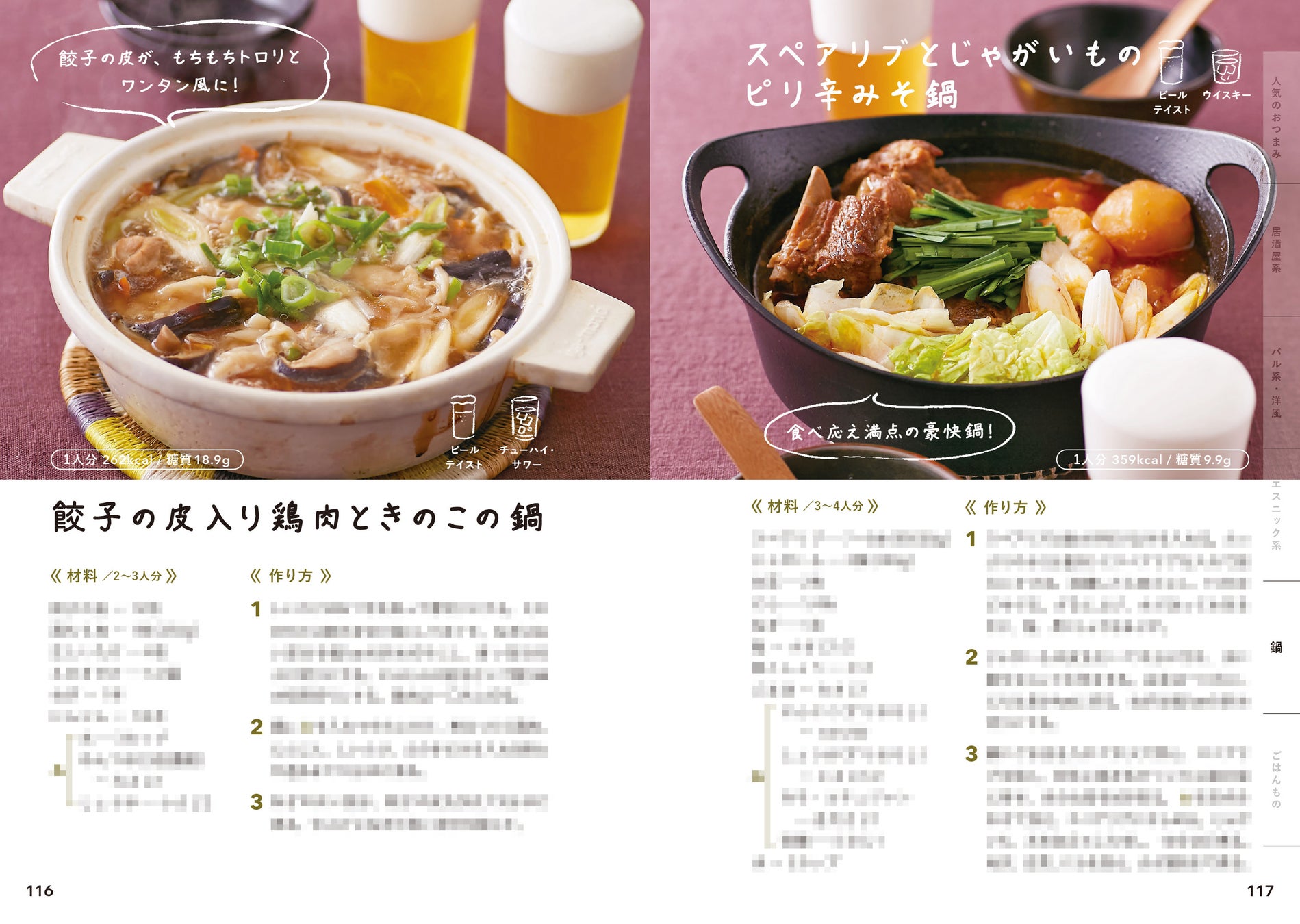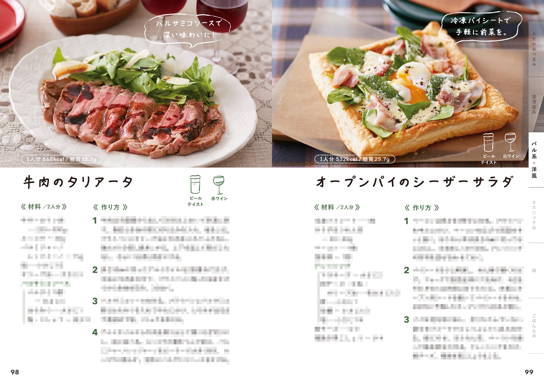 気分によっておつまみを選べるように「すぐできおつまみ」 「人気おつまみ」 「居酒屋系おつまみ」 「バル系・洋風おつまみ」 「エスニック系おつまみ」 「鍋」 「ごはんもの」で章分け。各レシピで料理にぴったりのお酒ペアリングを提案しています。