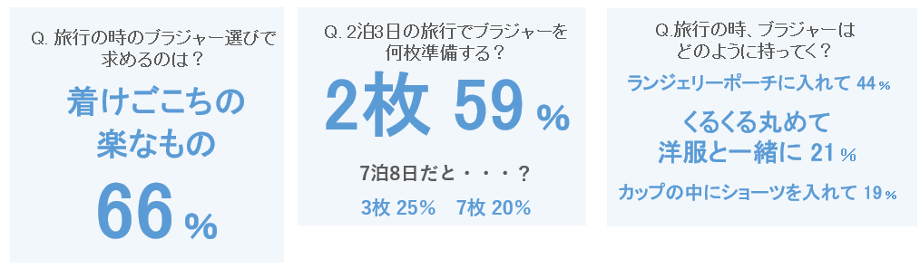 まず「旅行の時にブラジャーに求めるものは?」という質問には、およそ3人に2人の66%が「着けごこちの楽なもの」と回答!長時間の移動があったり、アクティブに動きたかったり。窮屈なランジェリーは、どうやら楽しい旅の妨げになると考えている人が多いよう。また、2泊3日の旅行には、ブラジャーを「2枚」持っていく人が59%と半数以上。旅行バッグへの詰め方では、「くるくる丸めて洋服と一緒に」21%や「カップの中にショーツを入れて」19%と省スペース&カジュアルに持っていく人も。
