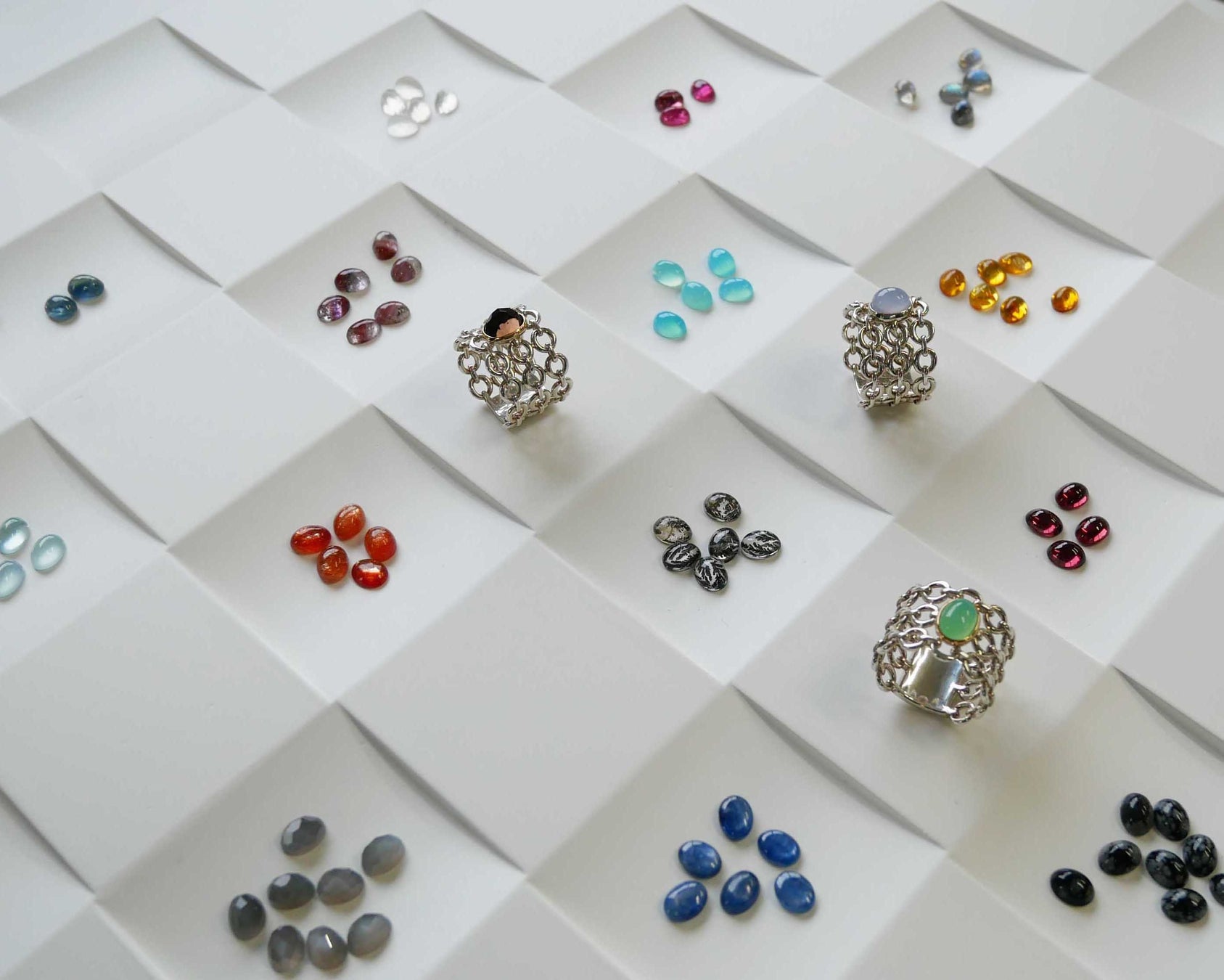 サファイアやロードライトガーネットのほか、今回のイベントのために用意したデンドリッククォーツやスーパーセブンなど希少な天然石と2種類の石枠を組み合わせてオーダーいただけます。