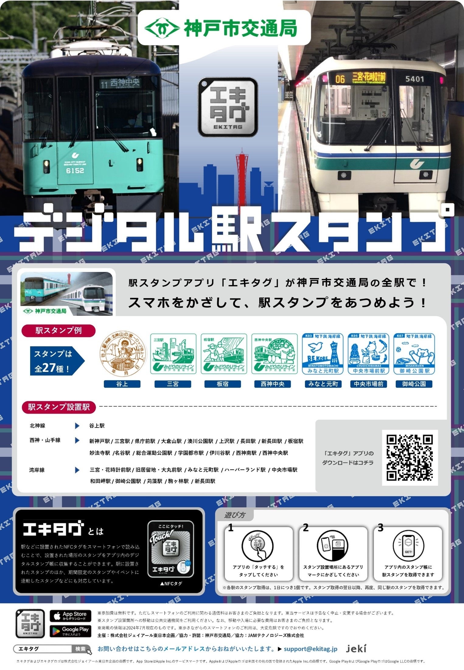 株式会社ジェイアール東日本企画が提供する駅スタンプアプリ「エキタグ」は、2024年7月5日(金)より神戸市交通局の「西神・山手線」「北神線」「海岸線」にてデジタル駅スタンプのサービス提供を開始します。