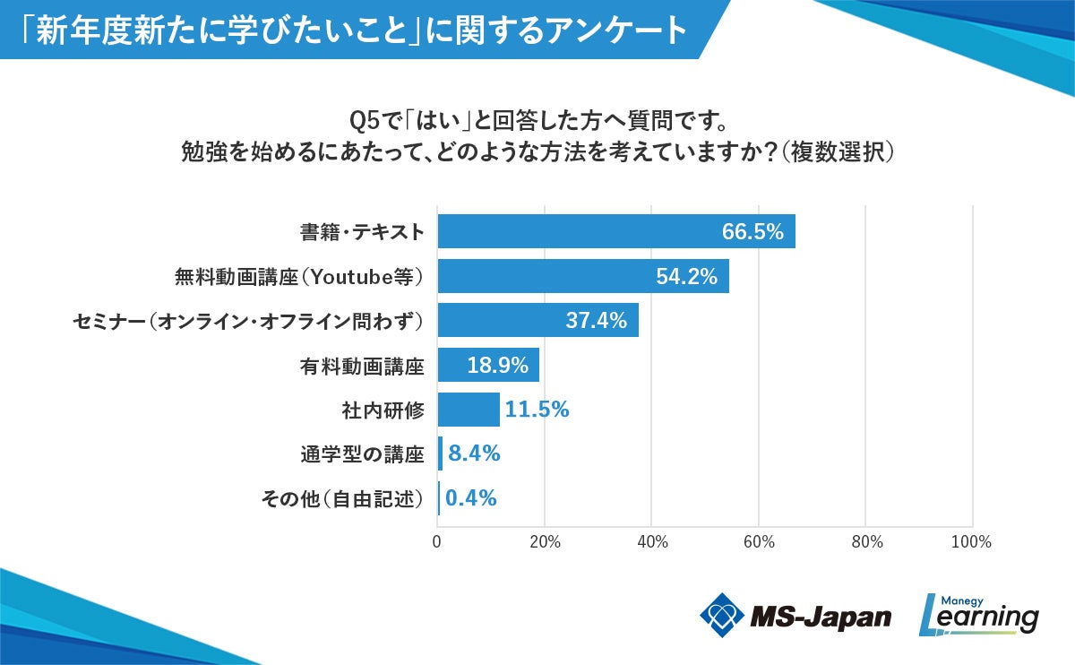 「書籍・テキスト」が66.5%、「無料動画講座(YouTube)」が54.2%と過半数が回答する結果になりました。