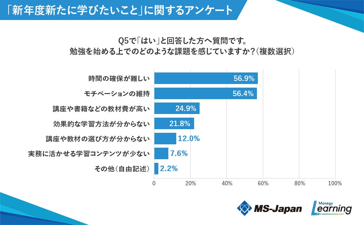 さらに、勉強を行う上での課題についても調査を実施。特に回答を集めたのが、「時間確保が難しい」「モチベーションの維持」で、ともに半数以上がこの回答を選ぶ結果となりました。