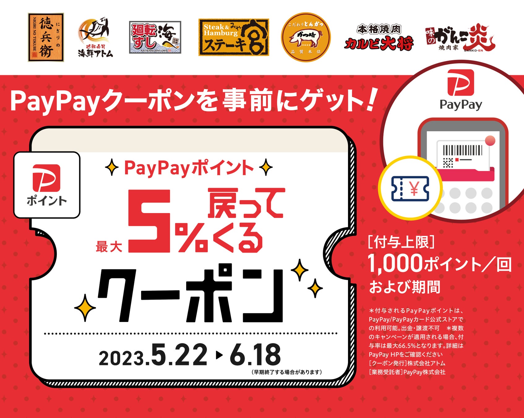 ステーキ宮・カルビ大将・がんこ炎かつ時・にぎりの徳兵衛・海鮮アトム・海へ PayPayでお支払いすると最大5%戻ってくる!!