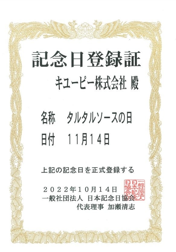 キユーピー株式会社(本社:東京都渋谷区、代表取締役 社長執行役員:髙宮 満、以下キユーピー)は、11月14日を「タルタルソースの日」として記念日登録を申請し、一般社団法人 日本記念日協会より正式に登録されました。