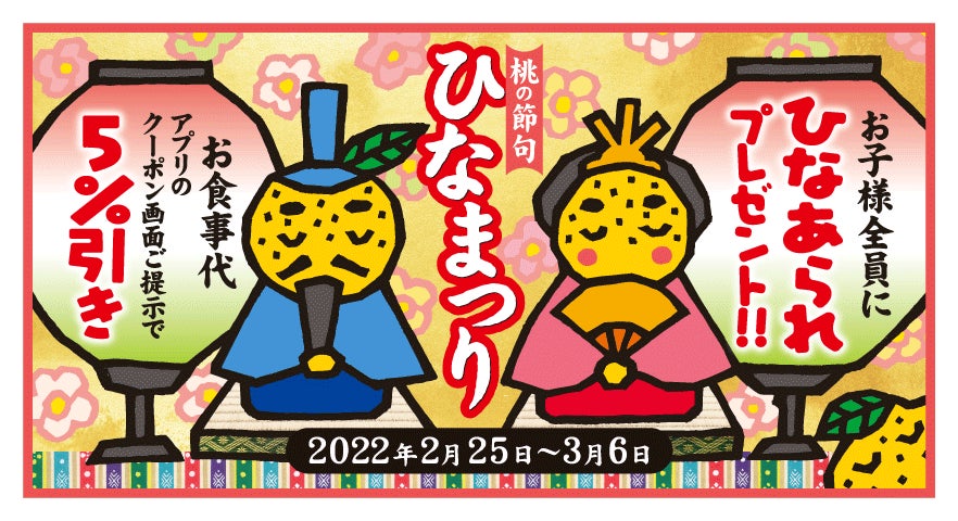 株式会社物語コーポレーション(本社:愛知県豊橋市/代表取締役社長:加藤 央之)は、全国93店舗展開する『寿司・しゃぶしゃぶ ゆず庵』(以下、ゆず庵)で、2022年2月25日(金)~3月6日(日)まで、小学生以下のお子さまにお菓子を、アプリ会員さまには限定お食事クーポンをプレゼントする「ステキな日本をゆず庵で〜ひなまつり〜」キャンペーンを開催いたします。