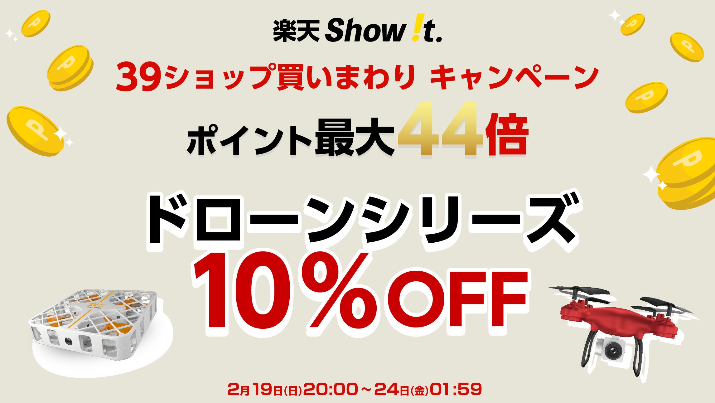 楽天「Show !t」私有地で上空からの撮影と運転操作を楽しめるドローンの10%オフセールを開始。2月19日(日)20時開始ポイント10倍!楽天39ショップかいまわりでポイント最大44倍に参加。