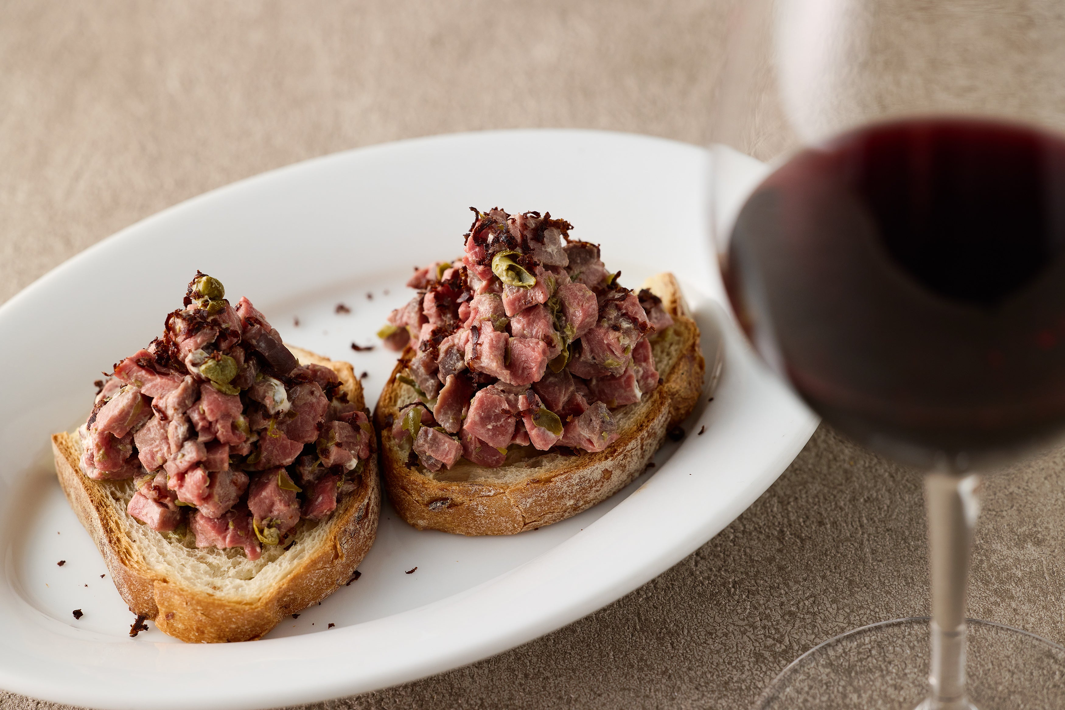 “お肉な気分”な日の最初の一品は、「和牛小皿 しんうち」の煮込みと和牛串のセットがおすすめ。老舗焼肉店の職人が手掛ける最高品質の和牛を使った逸品は安定感抜群の美味しさです。続く「虎ノ門 嚆矢」では、鍋ごと提供する絶品のカツ煮が食欲を満たします。最後に「W TORANOMON」では、鹿肉などから選べるボリュームたっぷりのロブロ ブルスケッタと厳選されたワインを中心としたお好みのドリンクがセットに。お腹も心も満たされること間違いなしのプランです。
