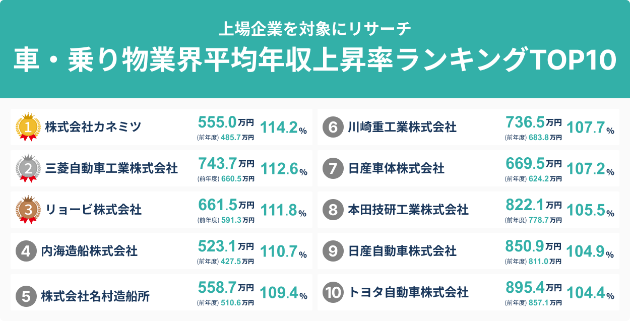 車・乗り物業界平均年収上昇率ランキングTOP10について