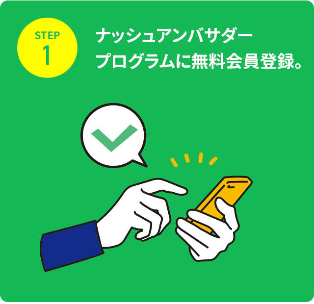 ナッシュアンバサダープログラムは、現在ナッシュご契約の有無に関わらず誰でも利用することができます。ご利用方法は以下の3ステップで可能です。