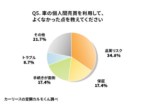 反対に、車の個人間売買を利用したことがある方に、よくなかった点を聞いたところ、最も多い回答は「品質リスク」で34.8%でした。具体的には「不具合を隠して売られた」「修理が続き、結局割高となった」「売買後にエンジントラブルが判明した」といった意見があり、品質や安全面の確認が十分ではない売買もあるようです。次いで多かったのは、「保証」「手続きが面倒」で17.4%でした。理由には「保証がないので不安がある」「名義変更が遅くなった」といった意見が見られました。