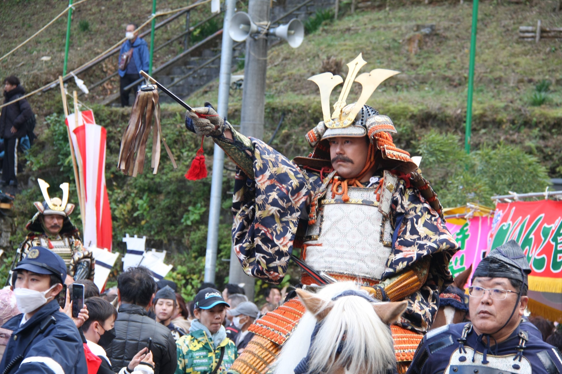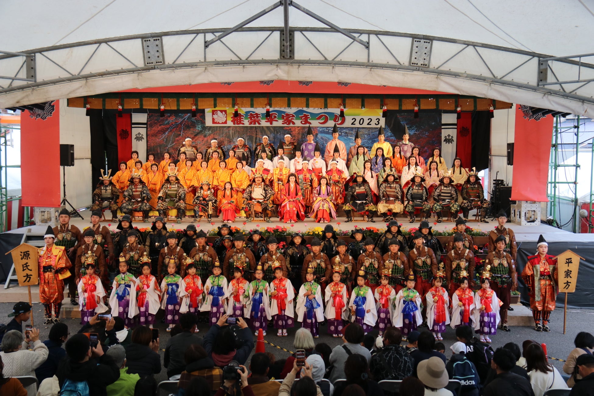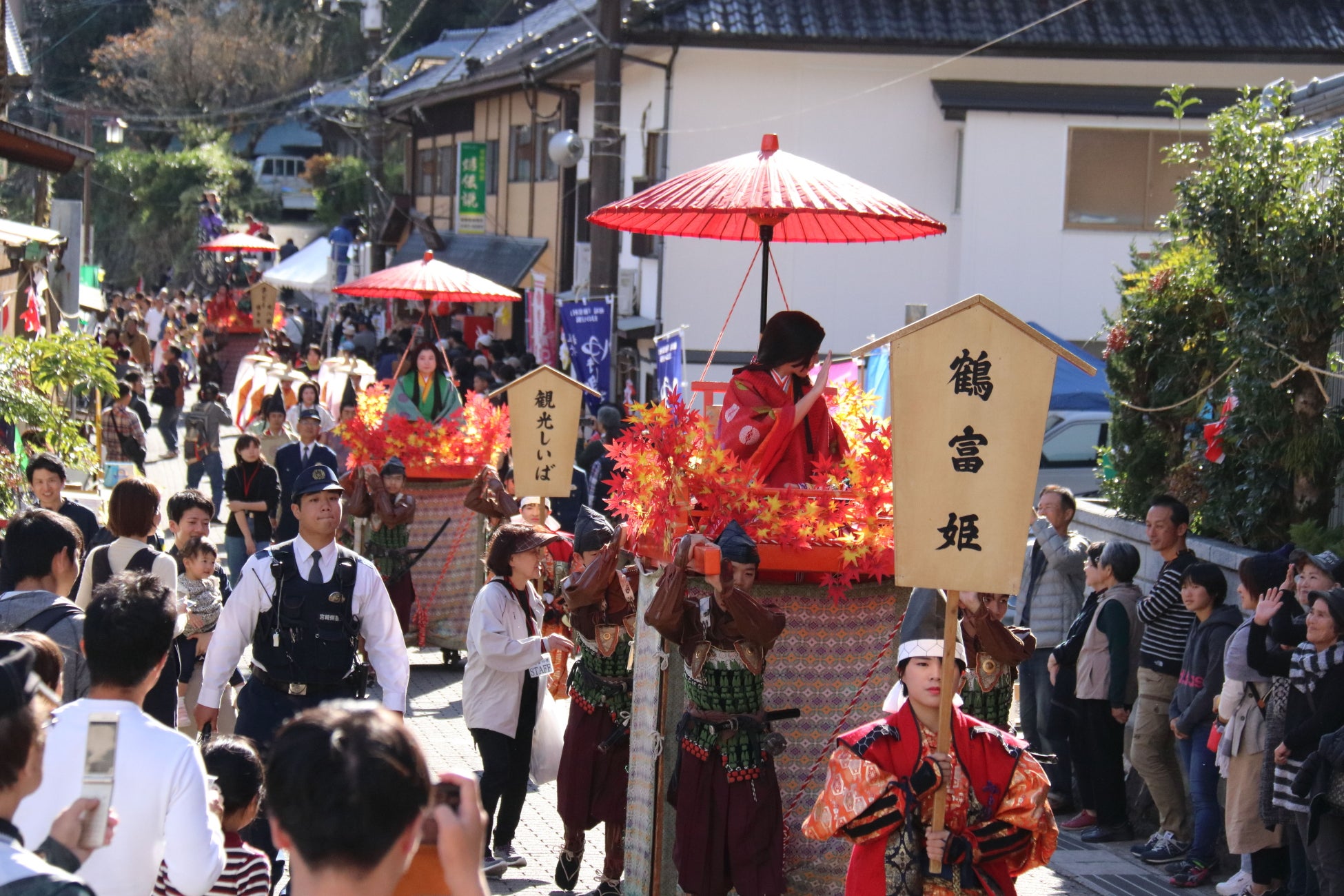 椎葉村は、平家落人の隠れ里として知られています。「椎葉平家まつり」は、壇ノ浦合戦より800年を機に地域振興の一つとして始められました。見どころは「大和絵巻武者行列」で、平家方と源氏方の豪華絢爛な行列が続きます。平家の末裔の鶴富姫と源氏の武将那須大八郎との悲恋を偲ぶ、壮大な平安絵巻が繰り広げられ、秋深まる上椎葉街道一帯が源平ロマン一色に染まります。椎葉の特産品展示即売会や、ご当地グルメなども登場し、椎葉の味も堪能できます。