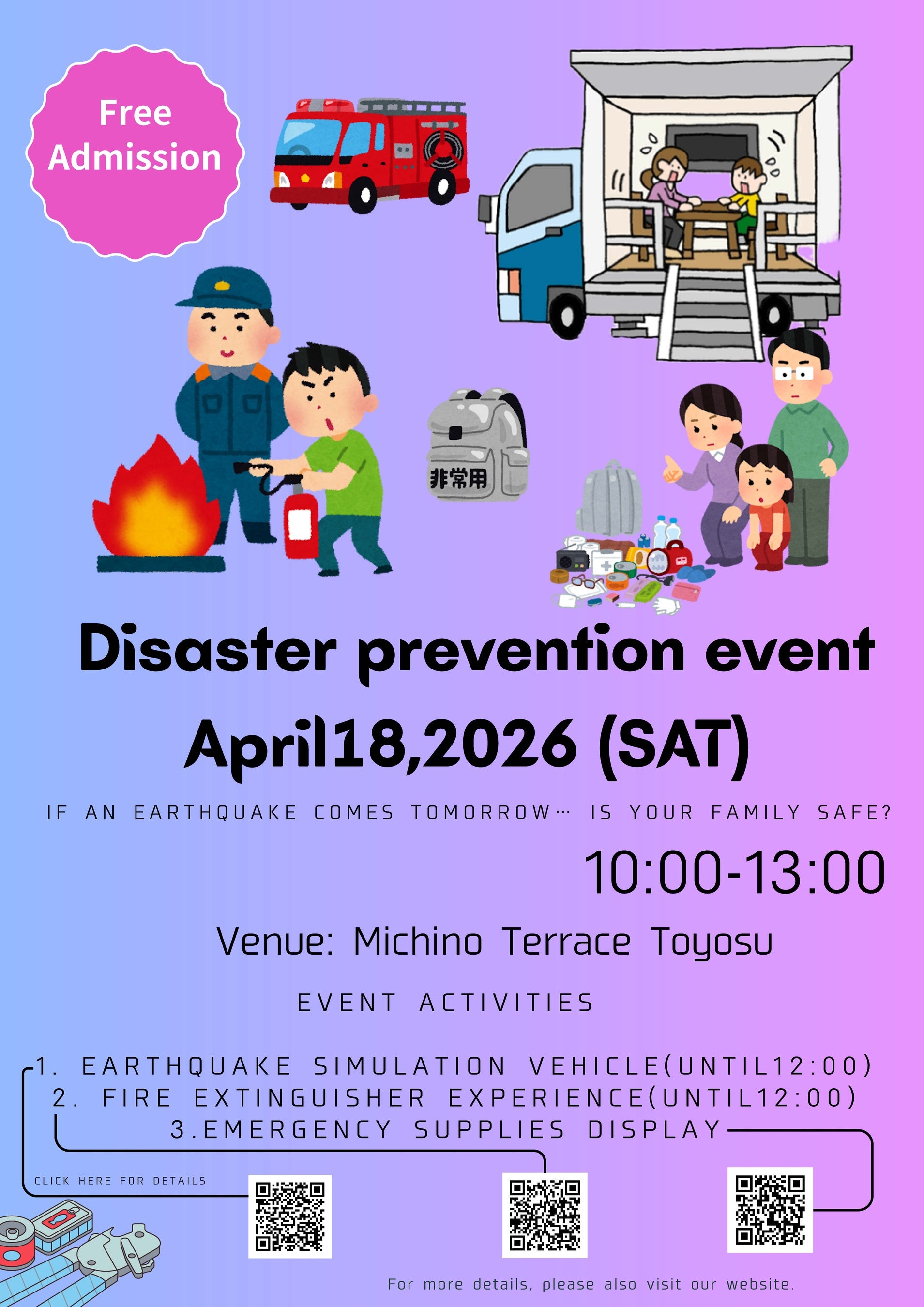 武蔵野大学(東京都江東区、学長:小西 聖子)のグローバル学部日本語コミュニケーション学科 神吉 宇一ゼミは4月18日(土)に、ミチノテラス豊洲で地域防災イベントを実施します。