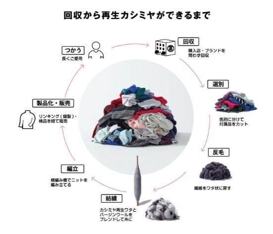 さらに資源の有効活用と、環境負荷を減らすため、お客様から回収したカシミヤニットなど(※)を生まれ変わらせた「再生カシミヤ混ニット」として、環境配慮型商品として製品化しています。今回は、店頭で、お客様から回収したカシミヤニットを初めて再生し、リサイクルで生まれ変わった “サステナブルなカシミヤウェア”として販売いたします。