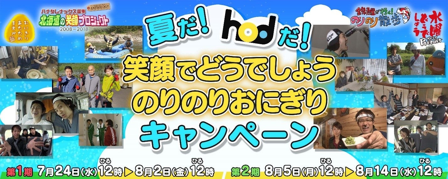 HTBの動画配信サービス『hod』(https://www.hod.htb.co.jp/)では、HTBでレギュラー放送中の4つのバラエティー番組のおススメシリーズを、通常価格のおよそ30%~50%引きの価格でご覧いただける、『笑顔でどうでしょう のりのりおにぎりキャンペーン』を実施します。