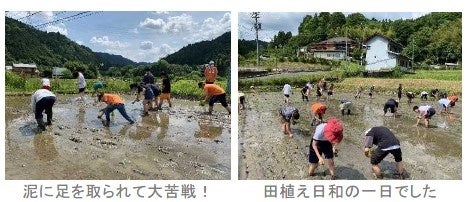 午後には、豊田高専ドミタウン実行委員会が借り受けた豊田市笹戸町の休耕田で、田起こしや苗の準備などの事前準備では地域住民の方々の多大なご支援・ご協力を得ながら、もち米の田植え体験を実施しました。暑いくらいの陽気の中、高専生や小学生、地域住民の方々が一緒に、田植えに励みました。