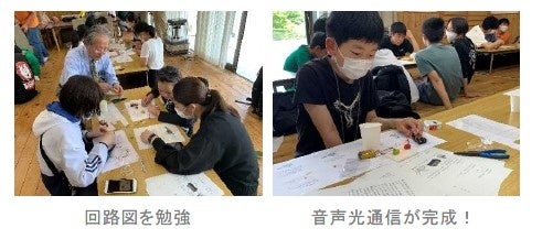 午前の「音声光通信に挑戦!」では、光送信機と光受信機を構成し、音声光通信機を作製しました。光送信機では音声信号をLEDの光に変換して伝搬させました。光受信機では、伝搬してきた光をフォトトランジスタで受けて、光を電圧変化に変えて音楽を鳴らしました。小学生の参加者は回路図を理解し、高専生と協力して音声光受信機を作製しました。