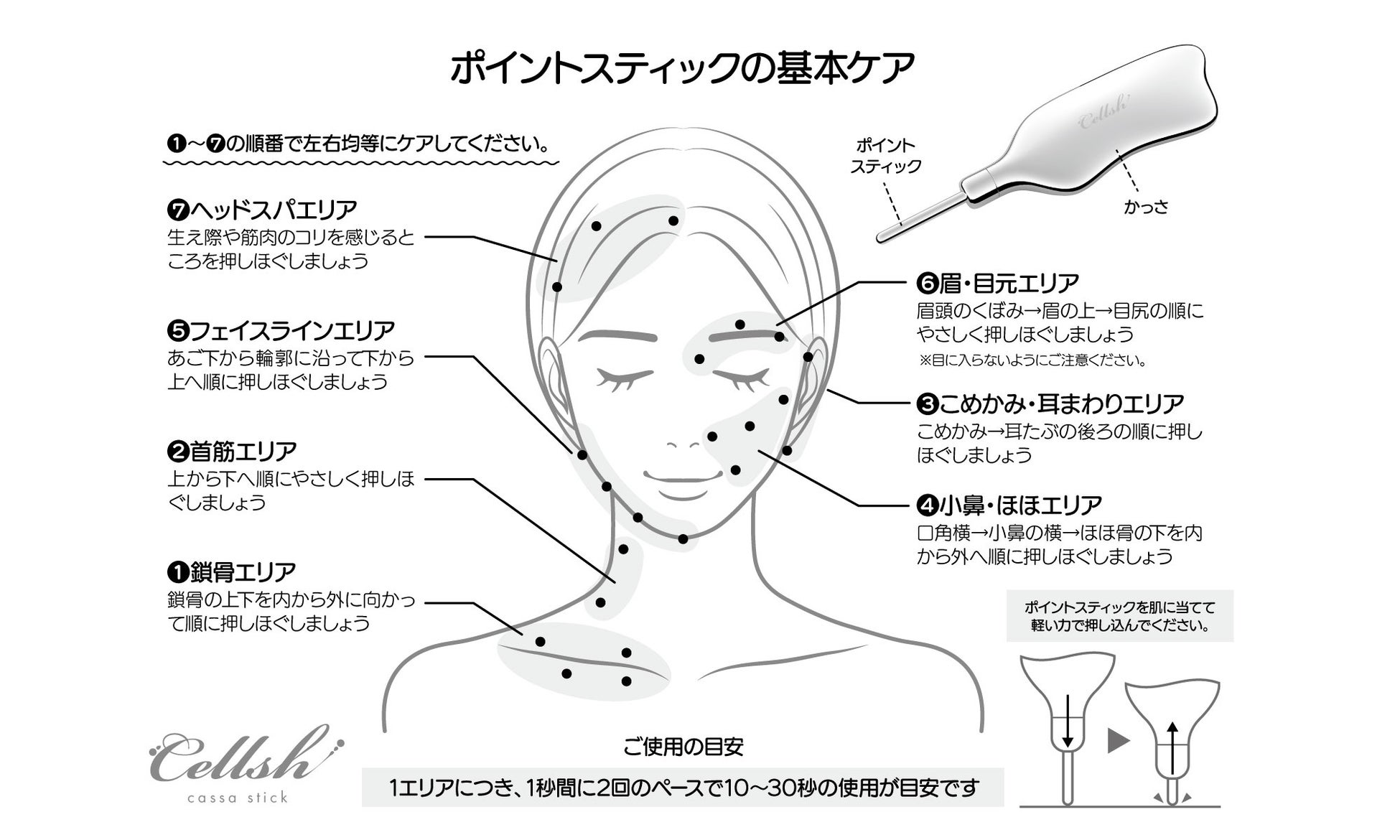 ※肌に対して垂直になるようにポイントスティックをあて、1エリアにつき1秒間に2回のリズムで10秒から30秒を目安にくり返し刺激してください。