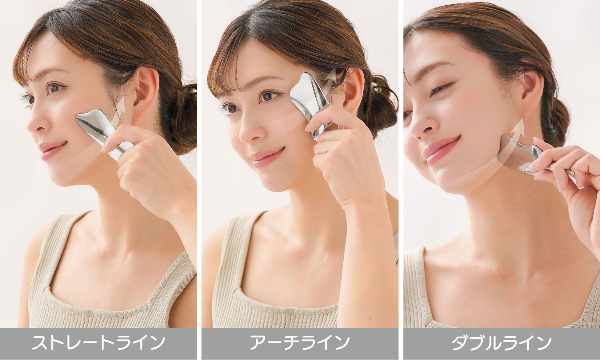 ストレート・アーチ・ダブルの3種類のかっさラインは、複雑な肌の曲線にフィットし、効果的なケアを実現!細部まで肌をやさしく流し美顔を目指せます。