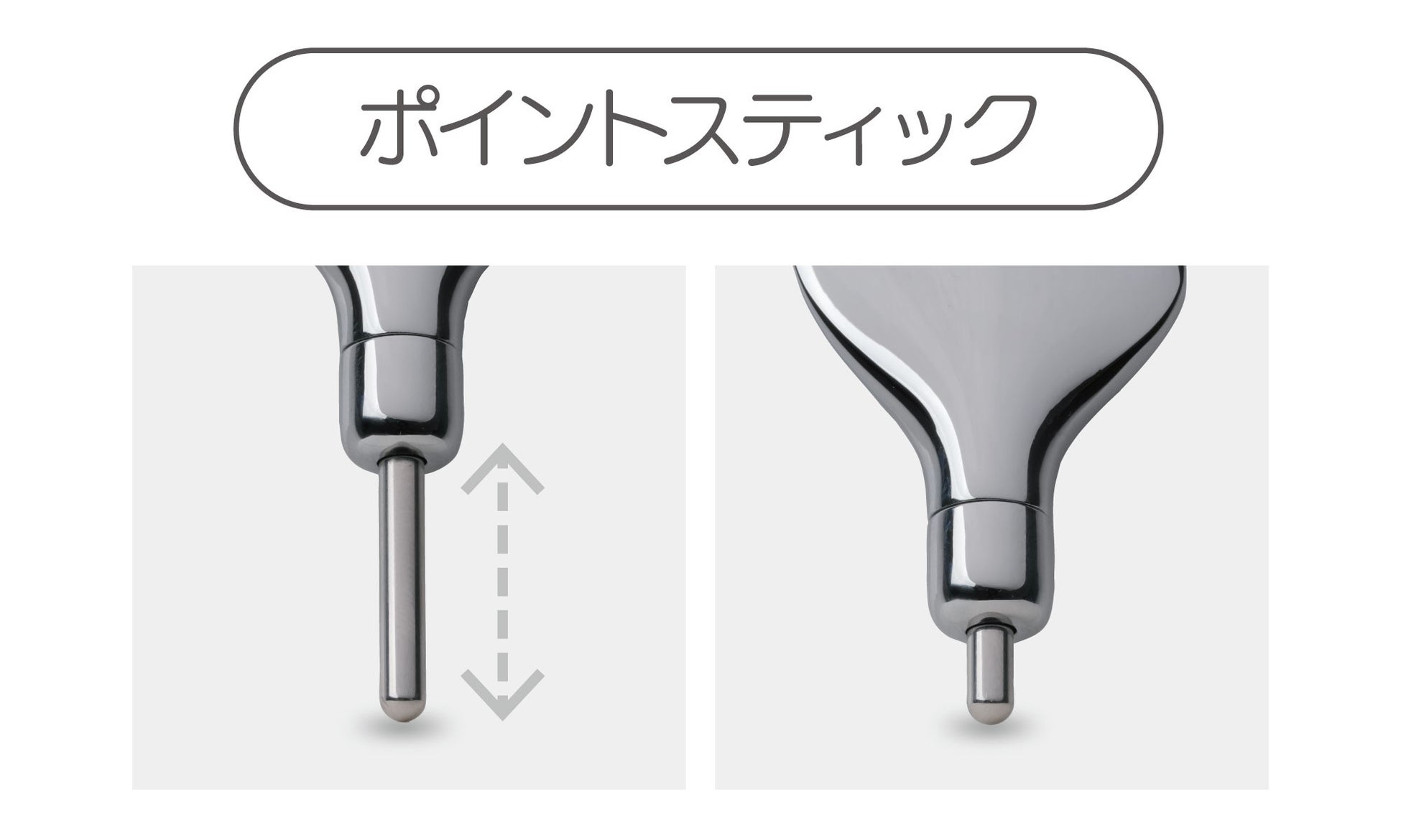 ポイントスティックは肌に押し当てると内部のバネの動きによりスティックが上下に伸縮し、程よい強さで筋肉のコリをほぐし血行促進をサポートします。点の刺激で顔まわりの細やかな筋肉までしっかりアプローチ。