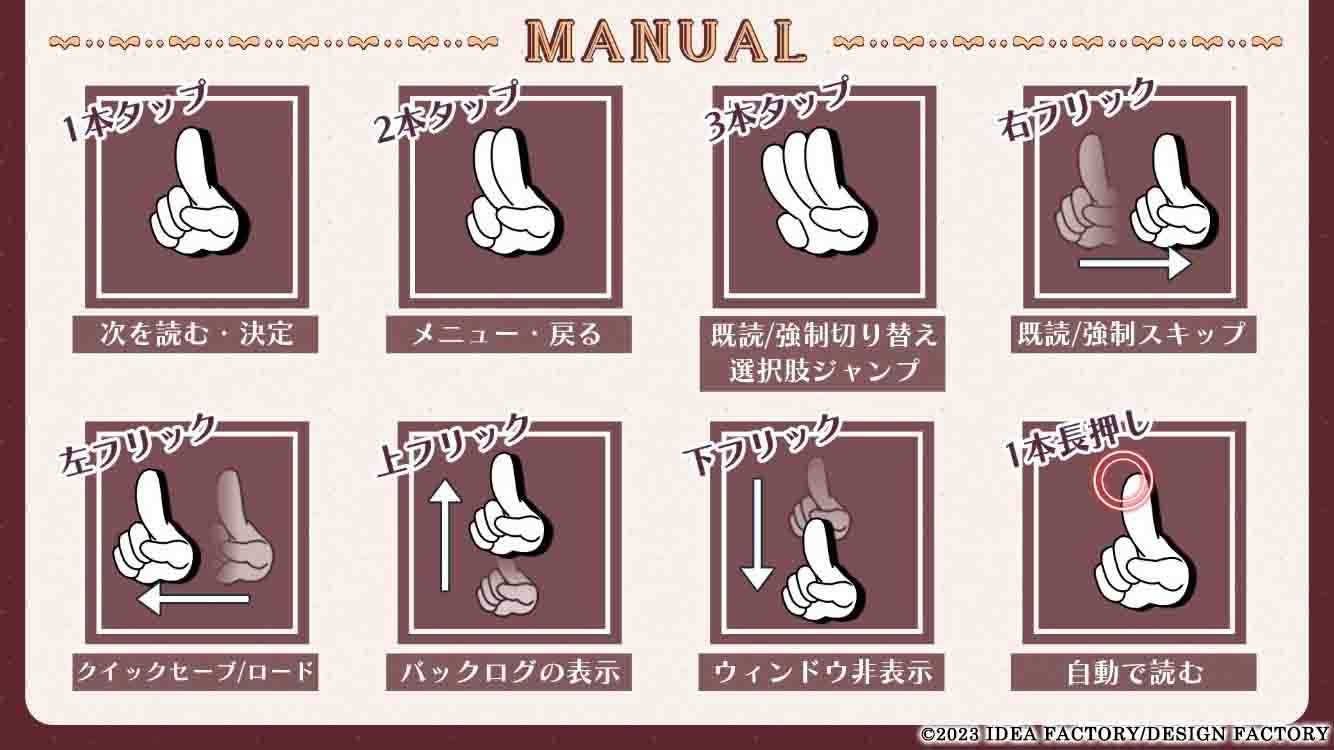 クイックセーブ、クイックロード、バックログ、既読スキップ、未読スキップ、オートモード、選択肢ジャンプなど快適にプレイできるシステムを搭載しています。