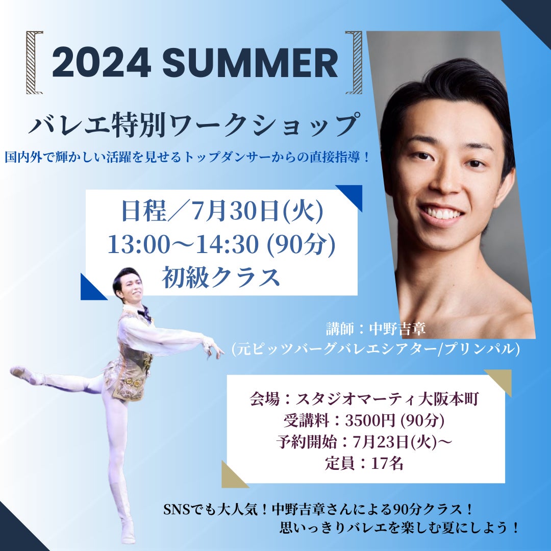 7月30日(火)、スタジオマーティ大阪本町(大阪市中央区)にて、元ピッツバーグバレエシアター・プリンシパルの中野吉章(なかの よしあき)による特別ワークショップを開催します。