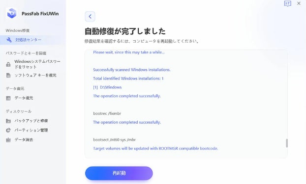 ステップ7:修正が完了すると以下の画面が表示されます。ここで「再起動」を選択して作業完了です。