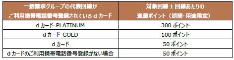 進呈するdポイント(期間・用途限定)は、「一括請求グループ」の代表回線をご利用携帯電話番号に登録されている「dカードⓇ」の種類によって異なり、対象回線1回線につき「dカード PLATINUM」の場合は300ポイント、「dカード GOLDⓇ」の場合は100ポイント、「dカード」の場合は50ポイントとなります。また、「dカード」のご利用携帯電話番号登録がない場合でも、対象回線1回線につき50ポイントを進呈いたします。