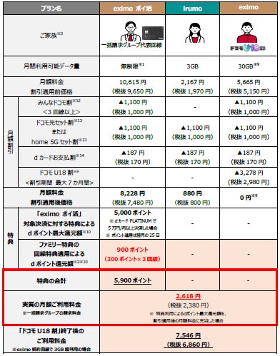 なお、「ドコモU18割」の適用期間終了後、「eximo」をご利用の方が3GB超のデータ量の場合、3回線分の月額料金の合計が実質7,546円となります。