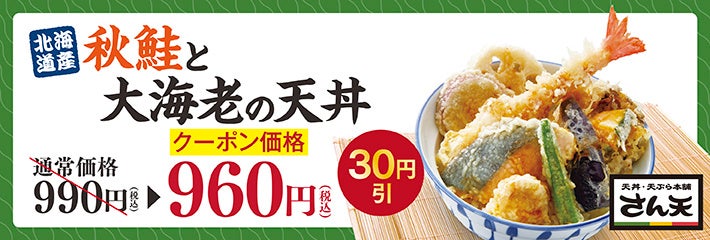 更に「天丼・天ぷら本舗 さん天」公式アプリでは、フェア商品でお使いいただける30円引きクーポンを配信いたします。ぜひ、お得にご利用ください。