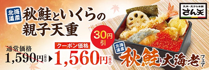 「天丼・天ぷら本舗 さん天」公式アプリでは、販売期間中に使える「秋鮭と大海老フェア 30円引きクーポン」「秋鮭といくらの親子天重30円引きクーポン」を配信いたします。会員の方限定でご利用いただけるクーポンですので、この機会にぜひ「天丼・天ぷら本舗 さん天」公式アプリをダウンロード&会員登録ください。