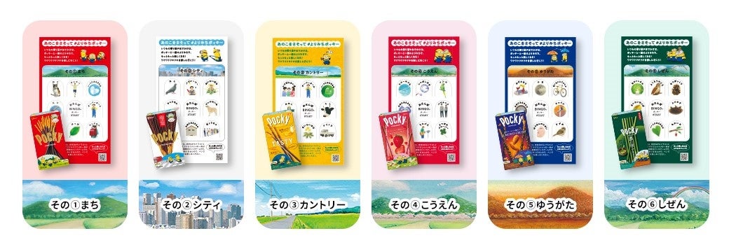 今回のコラボレーション企画の「おさんぽBINGO®-ポッキー-」では、よりみちをすることでお客様に日常を違った目線で見ることや、一緒によりみちをする人との視点の違いを楽しんでいただきたいと考え、限定イラストの描き下ろしを含むオリジナルのビンゴを制作しました。イラストの中には、「ポッキーにみえるもの」といった、人によって解釈が異なるものもあります。ビンゴの種類は全6種で、商品によって異なるテーマのビンゴとなっています。