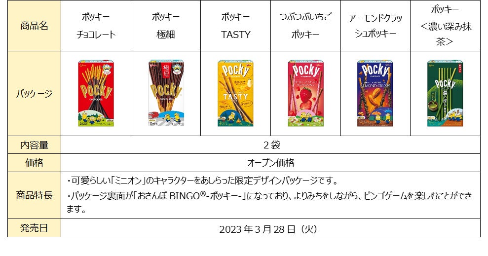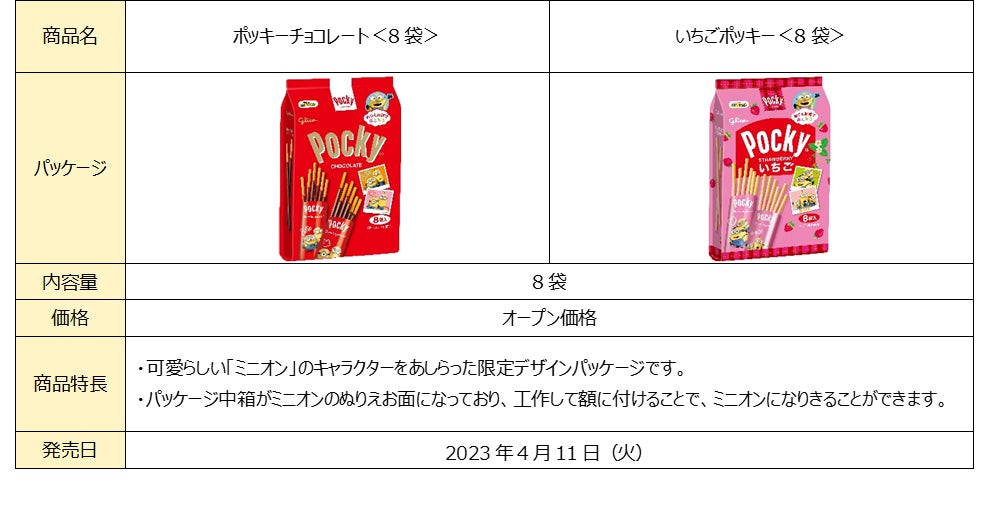 キャンペーンを展開するにあたり、よりみちをする時のワクワクドキドキ感をより一層伝えていくために、子どもから大人まで幅広い世代に愛される人気キャラクターの「ミニオン」とコラボレーションを実施。よりみちに出かける可愛らしいミニオンのデザインをあしらった「ポッキー」小箱6品を3月28日(火)より、大袋のホームユース2品を4月11日(火)より発売します。